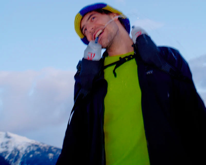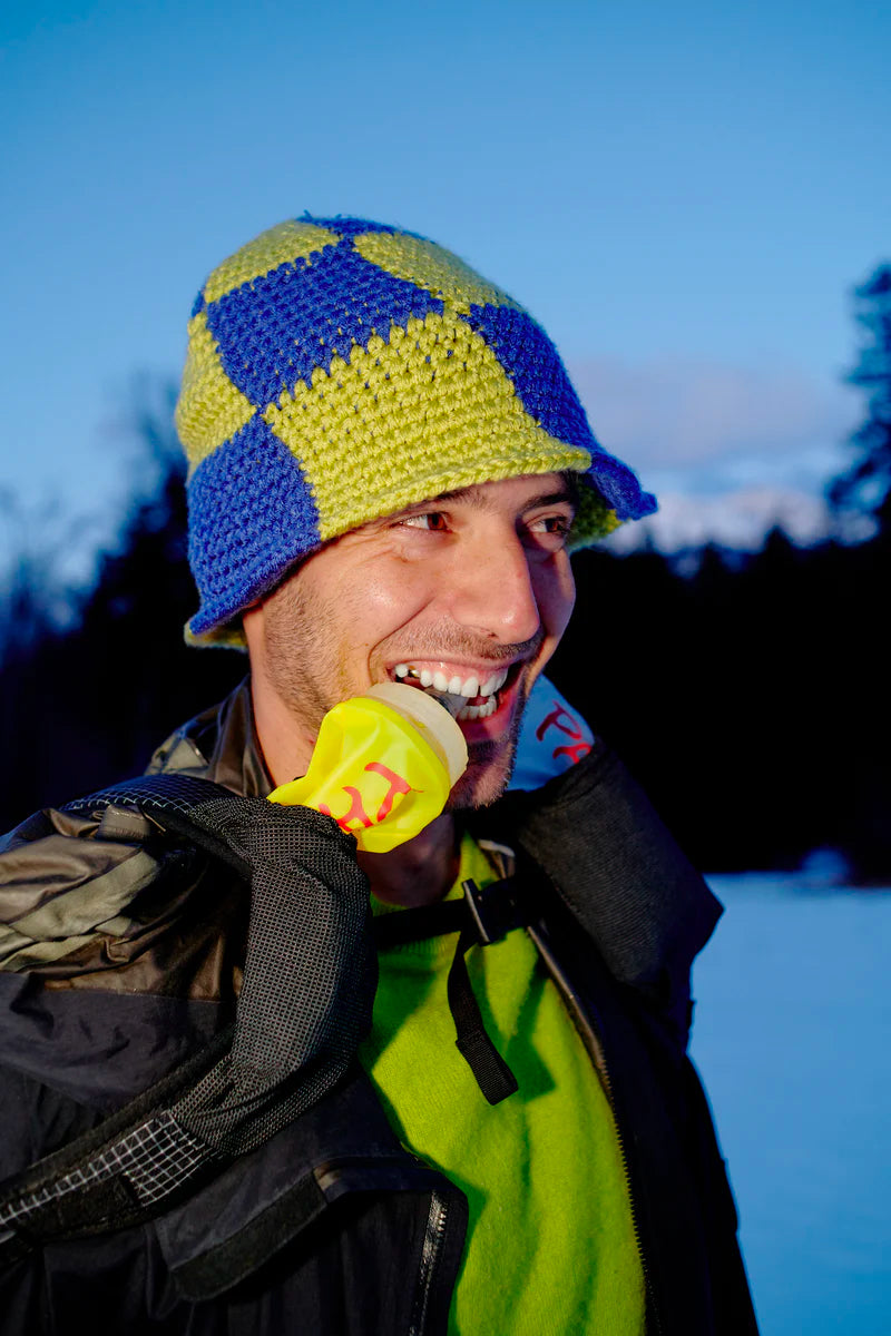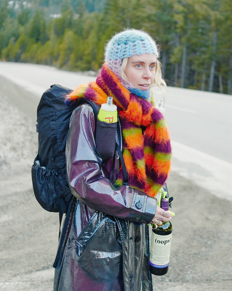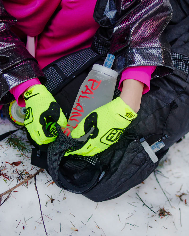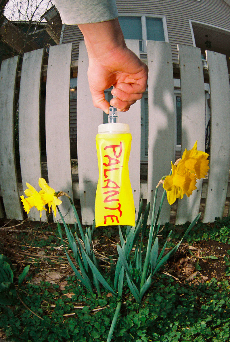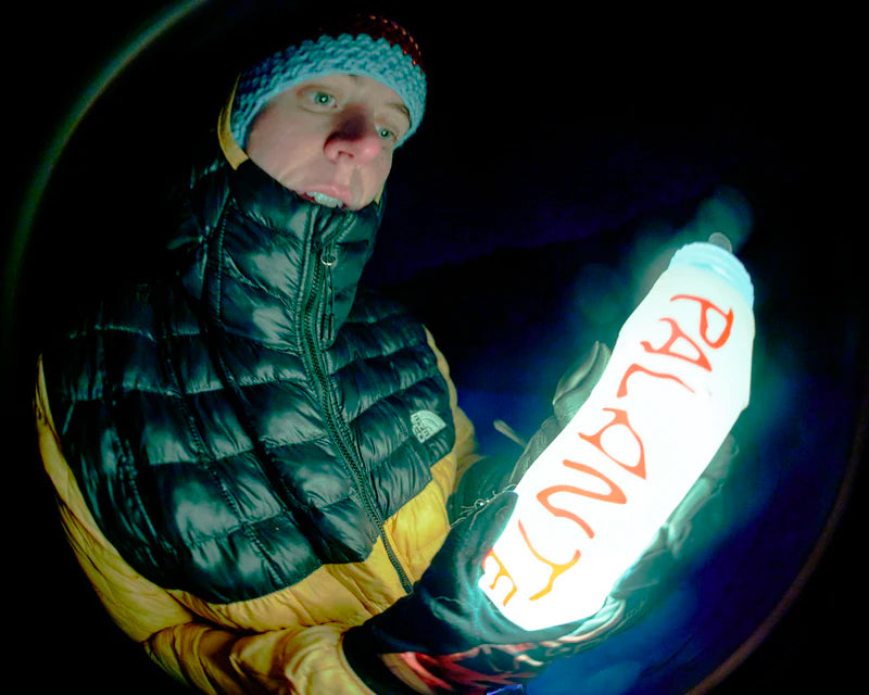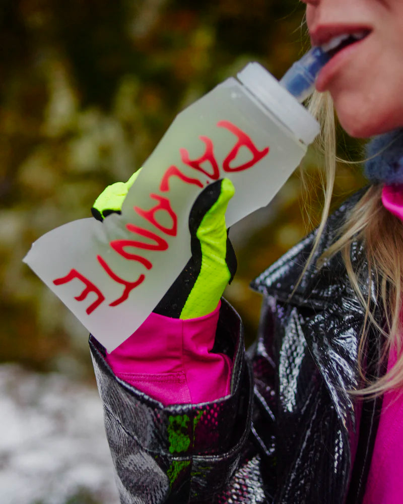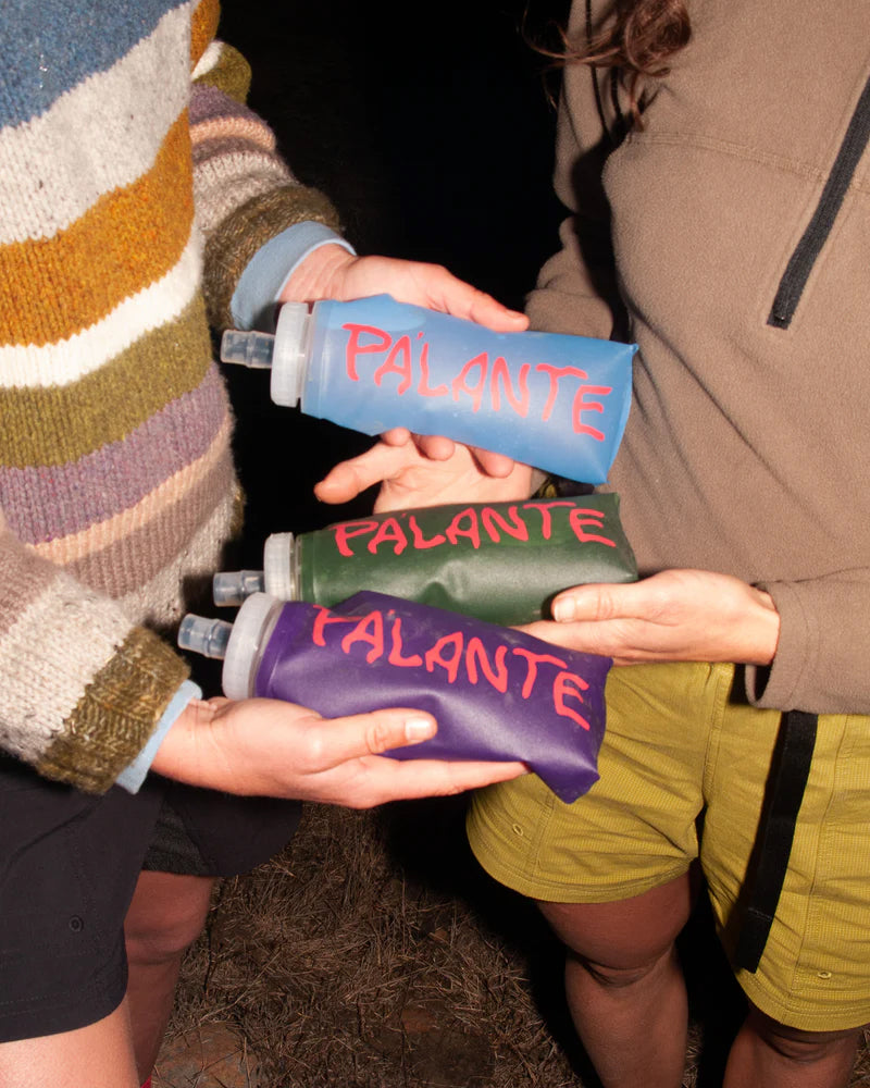 "パランテのバックパックに搭載された胸ポケットに収納することができ、水を濾過するために開口部が大きくて便利なウォーターボトル。"